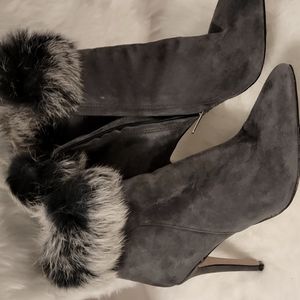 Worn only 1x great condition, gray suede booties with feaux fur on top and zipper side detail