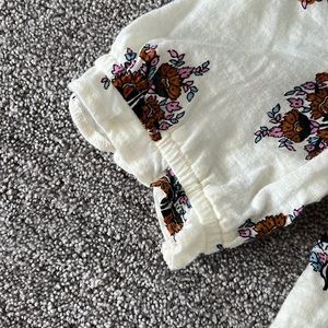 Cream color with floral print, small ruffle details on sleeves, and button on back