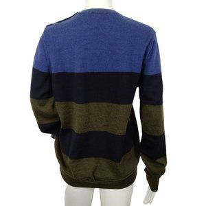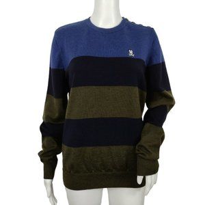 Psycho Bunny 100% merino wool sweater in women's size medium. Crew neckline buttons on one side. Psycho Bunny logo embroidered on chest. Wide multi-colored stripes. Long sleeves. Rib knit collar, cuffs and waistband.