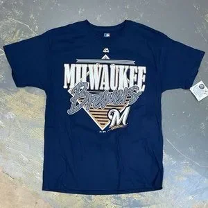 I’m selling a Brand New with Tags Majestic Brand Shirt Tee featuring the Milwaukee Brewers in Navy with White and Gold Vintage Retro logo printed on
