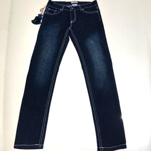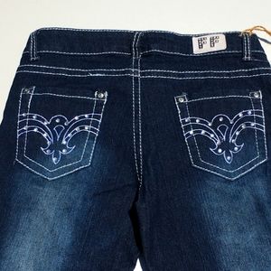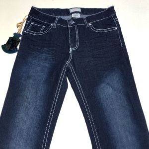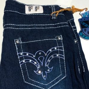 F.F. Jeanswear Blue Jeans Size 8 feature bold white bordered stitching with gorgeous designed embroidery on both back pockets and a diamond button fly. FF 3D faux diamond encrusted white label. Faded distress on thighs front and back. New With Tags.