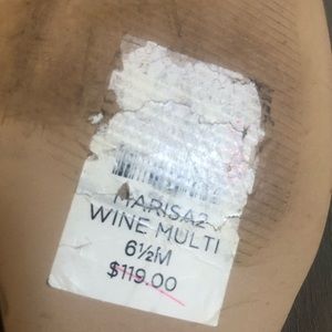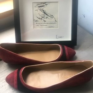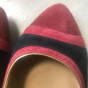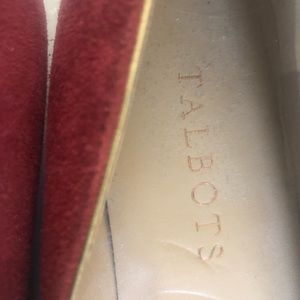 This is a lovely pair of suede slip on shoes designed by Talbots , they are shades of maroon & black , simple slide with wedge heels 3/4” , the toe is a soft rounded ballet point .. maroon toe & sides , black heels & trim with gold tone trim .. size 6 1/2 ..bottom is scuffed from trying on , but they are NWT