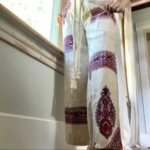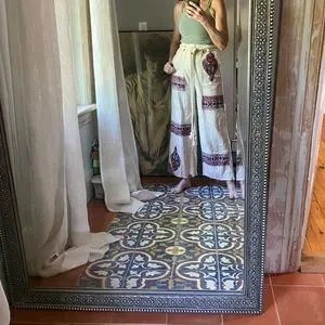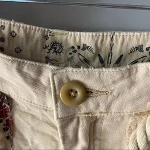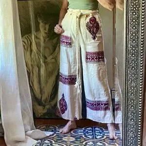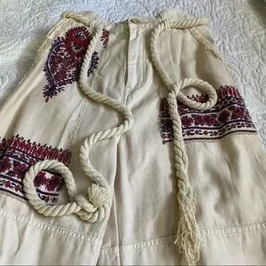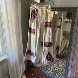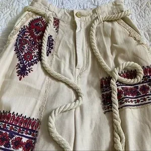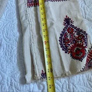 Wonderful patterned Free People jeans with high fitted waist and comfortably wide legs, distressing throughout, zippered and pocketed, stylish. Approximately 37” long, 24 1/2” waist, fits tts, new