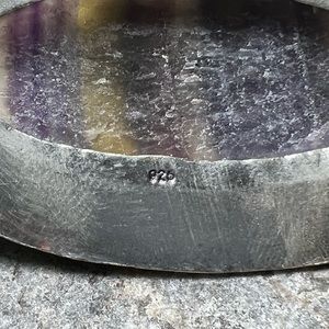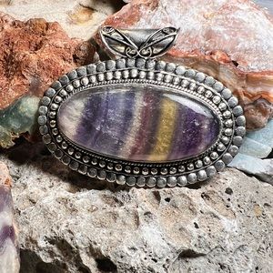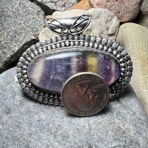 Beautifully hand crafted silver tone pendant with an absolutely beautiful purple fluorite banded stone. This pendant is 925 stamped however has tested negative for precious metals therefore has an overlay or plating only. The stone however has been verified as authentic. Stone has slight chipping on the front. This listing is for the pendant only. All tags are handmade.
