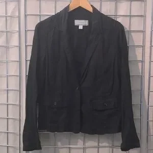 Linen blazer jacket with 1 button closure, lapels and pocket details. Size L, length 22.5, Caslon. Washed effect w twill tape detail