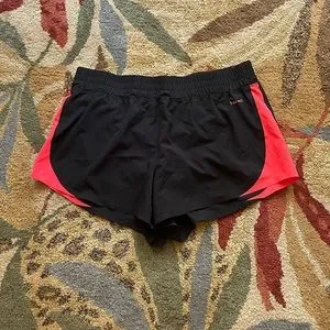 Nike pink and black running shorts. Stretchy band on waist, good for the summer and for working out in!!