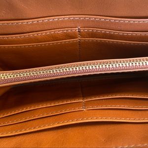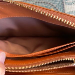 Simple and convenient, with a raised tonal logo placed front and center the leather Bombé Zip Continental Wallet features plenty of interior pockets for keeping essentials organized and a zip-around closure to ensure your belongings stay safe and secure. Made of rich Italian leather, its streamlined design features plenty of interior compartments for storing all of your essentials. Zip around closure. 8 card slot pockets; 2 currency compartments; 1 center zipper compartment. Color is more of rust-orange/brown. I have used this wallet but it has a lot more life. Even though it has marks & tiny spots(see photos), it’s in Good-Great condition 😊