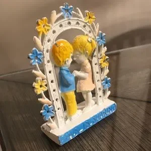 Sweet design of boy and girl holding hands inter a trellis of flowers. White, blue, yellow and pale pink in color.