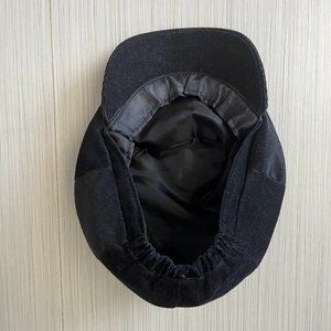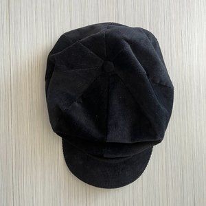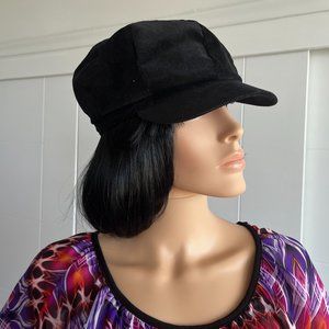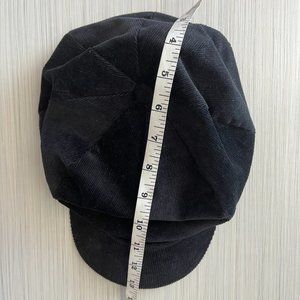 Black corduroy "Newsboy cap" in new condition. 2" bill, button on top, 3.5" elastic band at back center, fully lined in black poly, new condition, cool cap can be worn with many outfits! ONE size fits most!