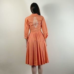 Gorgeous 1940s day dress with embroidery and bead detail. Truly stunning dress in excellent gently used condition. Material is a beautiful and bright coral color and feels like cotton. Note the material is textured best seen in last photo.