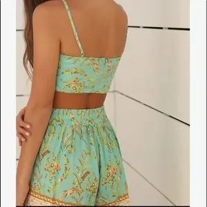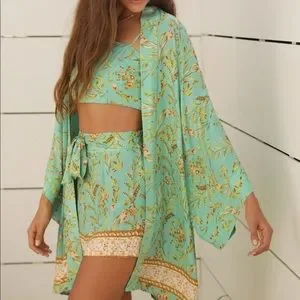 Boho Bohemian Tropical Floral Print Cami Top Kimono CoverUp Shorts Set Green