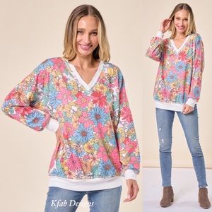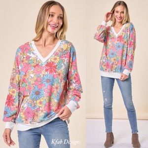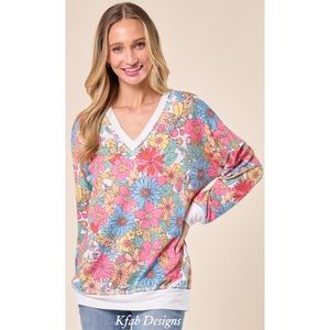 ❤️NEW! V Neck Floral Print Sweatshirt with Contrast Neckline, Cuffs, and Band!