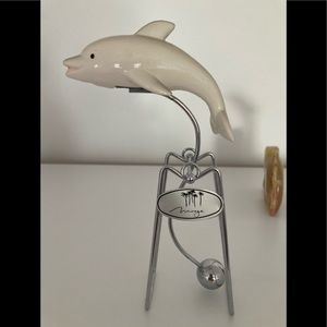 gray dolphin on a swinging pedestal. Tag says Mirage.