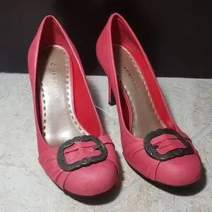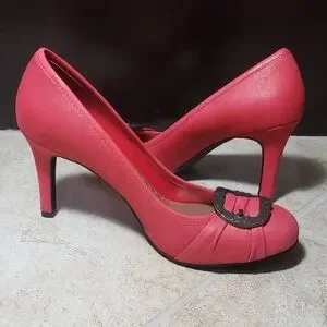 Gently loved in excellent condition! Soft red leather 3.25 inch high heel shoes with bronzed metal buckle. Closet kept in a pet and smoke free home.