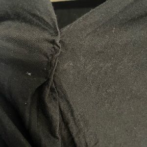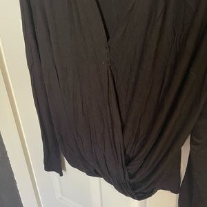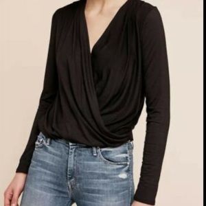Size small long sleeve black wrap too from Anthropologie. It started to come apart where the wrap meets at the cleavage, so it is mended there with black thread. Shown in pictures. Still looks good on and I just want to give this a new home!
