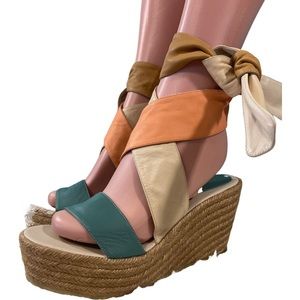 Super cute Chloe wedge sandal that features lace up leather ties and espadrille platform heel. Super soft leather in cream, tan, green and an apricot orange. Size 41.