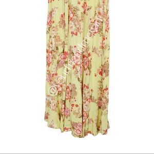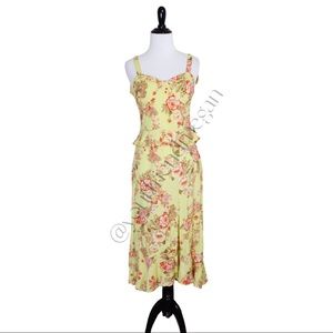 Description: Sweetheart neckline. Bustier top. Ruffles. Floral print. Leg slit. Smocked back. Tie straps that don’t adjust the strap length. Chartreuse and spiced coral.
