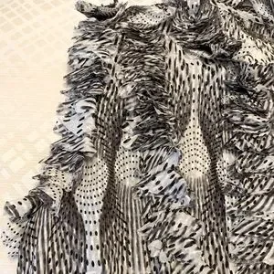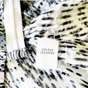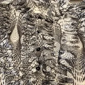 Feather ruffled details around shoulders and yoke make this light and airy sleeveless silk blend St John Couture blouse in black & white a stunning addition to your wardrobe. Layer or pair alone with a variety of bottom options. It’s difficult to capture the lovely texture of this timeless piece🪶