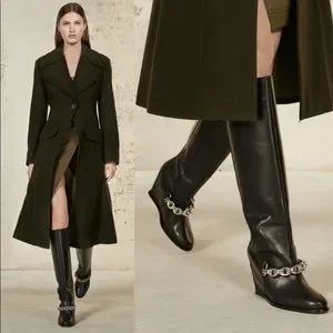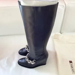 Zara Long Black Leather Wedge Silver Metal Chain Boots SZ 6