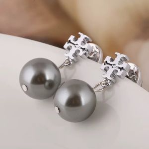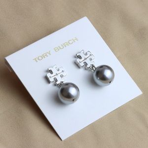 Tory Burch Small Silver Logo Gray Pearl Drop Earrings