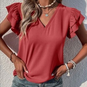 Casual Plain Solid Top V neck Tiered Layer Butterfly Sleeve Cap Sleeve
