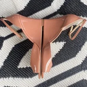 Patent wedge with ankle strap. Blush color. Never worn but sole has a little discoloration as pictured. Wedge is ~4”.