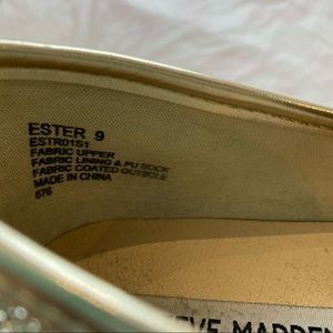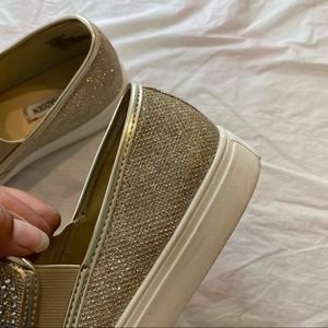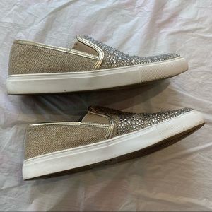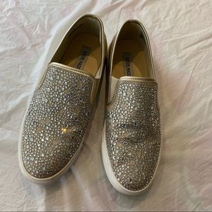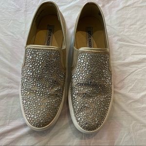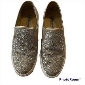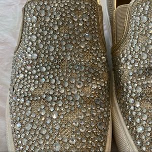 Steve Madden Crystal Slip ons SZ 9 style Ester in Beige and silver golden specs through out. No rips tears NO missing Crystals in great condition only outside soles have worn look see pictures. Super Comfy Clean inside