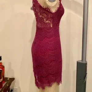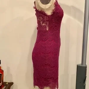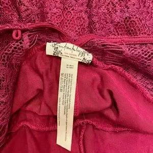 Magenta free people lace halter dress with scallop arm hole and hem.