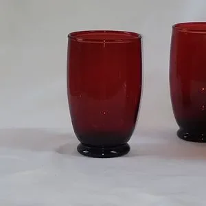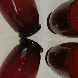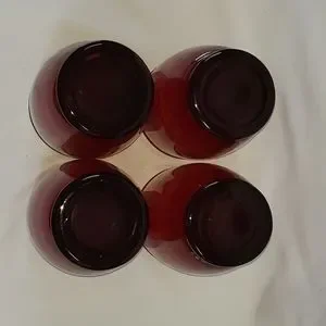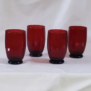 VINTAGE! Set of 4 ruby red glasses by what I suspect to be Duncan Miller. Filled almost to rim holds 10 oz. Condition is everything... EXCELLENT CONDITION! No chips, cracks or scratches.