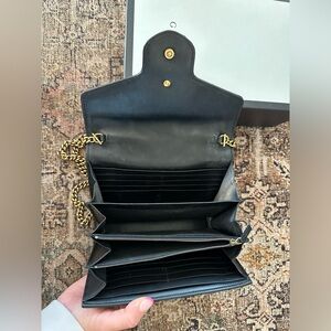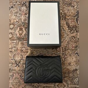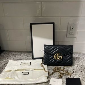Lightly used black leather Gucci bag! Gold chain strap. A couple lipstick marks inside. I have the box, dust bag, and receipt