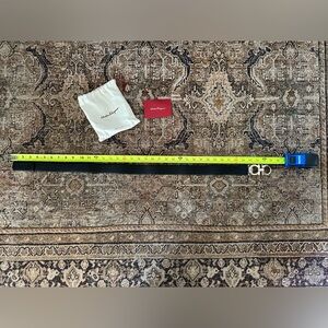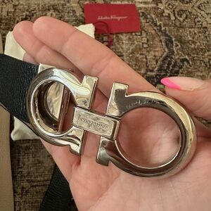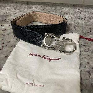 Salvatore Ferragamo reversible belt black and light nude color with silver buckle. 34 1/4 inches strap, strap in great condition buckle very lightly scratched, not too noticeable. I have dust bag and receipt.