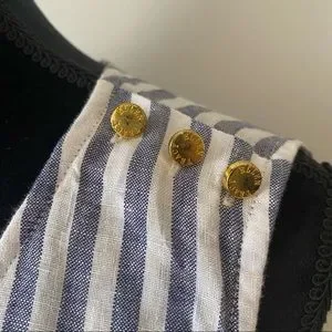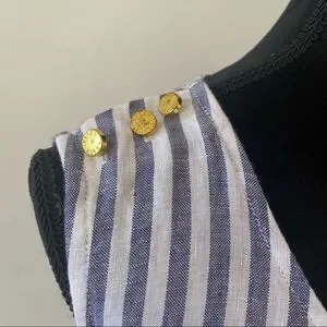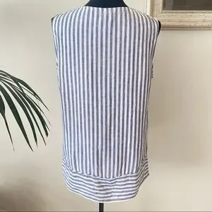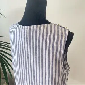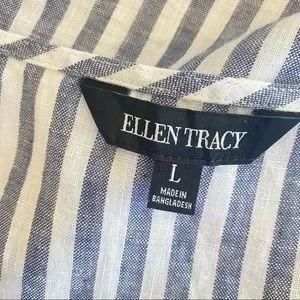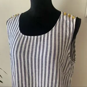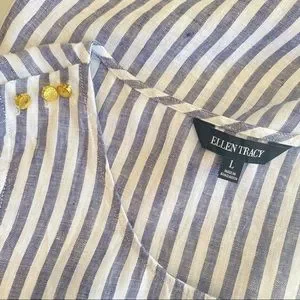ELLEN TRACY Striped Linen Relaxed Blouse White Blue with Gold Shoulder Detail L