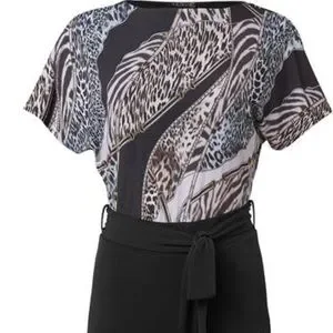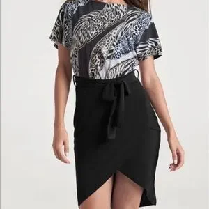Mixed animal prints add a fierce edge to this sleek silhouette that is defined by fluttery short sleeves and a solid color wrap-style skirt that reveals a flash of leg! The self-tie sash belt around the waist finishes the front with a feminine bow for a look that is wildly elegant