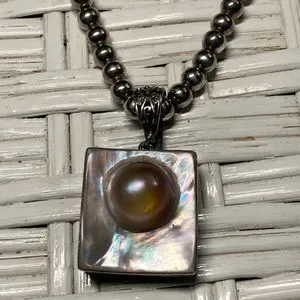 This unique necklace features a square piece of silver with either a shell or natural pearl hemisphere. It is attached by a filigree loop to a chain made of hollow silver beads. It looks like and has the solid feel of 925 silver but it is not stamped. 24” chain length. Working clasp. A beautiful mix of nature and silver!