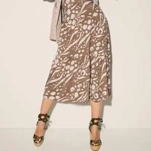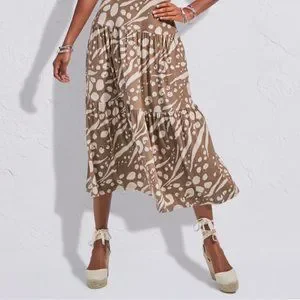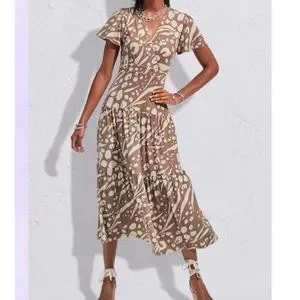 This is a beautiful taupe midi dress with an abstract skin print design throughout, it features a crossover front with short flutter sleeves, an empire elastic waistband, and full, tiered skirts for added movement. Has an adjustable ruching at the back lets you customize a cutout for a peek of skin. Has a fitted bodice and is made of a rayon jersey knit.