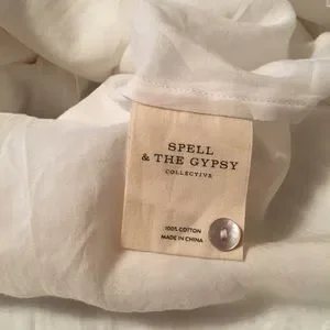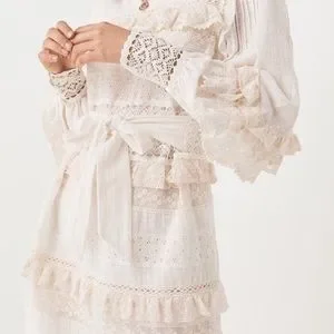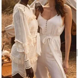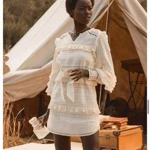 NWT Spell Suki Mini Party Dress in white. Size medium. Fully lined. Due to the lace, there is no stretch so it’s a form fitting dress! Measurements provided in pics. Attached ties at the sides that you can tie either in front or in back.