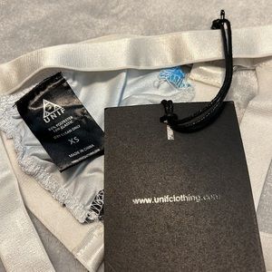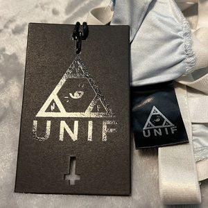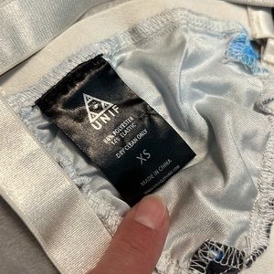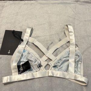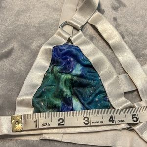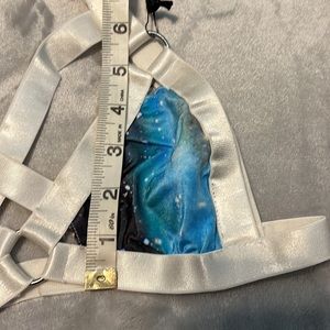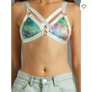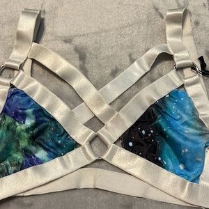 UNIF Downer Galaxy print bra in a size XS. White crisscross bondage style bralette with galaxy print cups, best fit for an A or B cup. Please refer to measurements in photos to best determine how it will fit you. New with tags never worn condition and hard to find item.