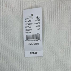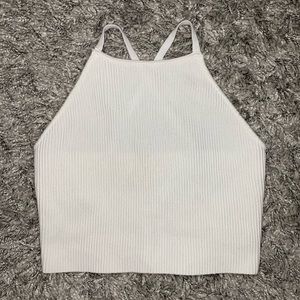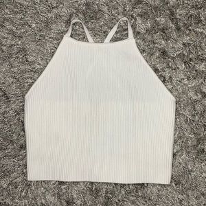 White ribbed knit sleeveless tank top. Straps cross at back.