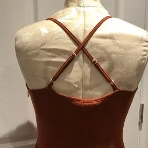 Beautiful and comfortable burnt orange/rust coloured v-neck sundress with buttons down the front and crisscrossed straps in the back. The straps are adjustable. Waist is elasticized but not too much, and there is a side zipper. Fabric is stretchy. NWT, never worn.