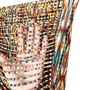A gorgeous multicolor abstract tribal-inspired print with shades of turquoise teal, marigold yellow, white, black, burgundy brown, & orange