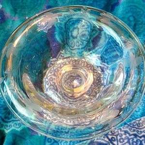 Glass bowl with etchings of leaves around top ring there is a base that measures 4" across with the bowl on top measuring 7"