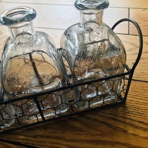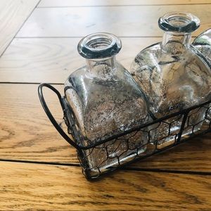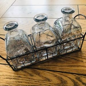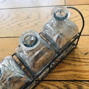 What a classic and chic home decor item ! Use it on your table, mantel, or in your bathroom for a bit of rustic charm !! I used to clip a single flower and place in each bottle. Subtle silvering on the bottles.