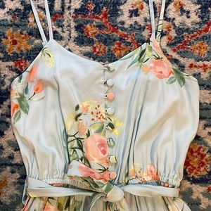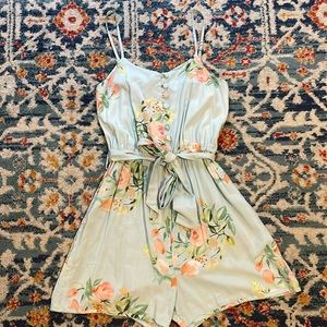 Light blue romper with pink and yellow floral details. Tie waist, buttons, zip up back. Soft, comfortable, worn only once.