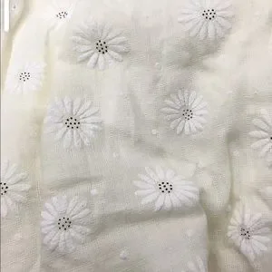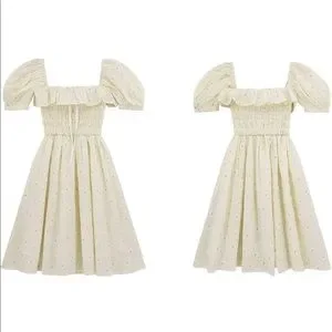 This adorable summer neutral dress features puff sleeves and a beautiful textured flower fabric. It’s only been worn once so it’s in great condition.