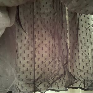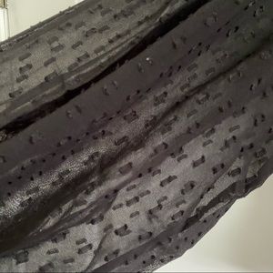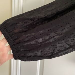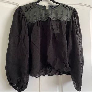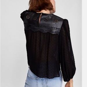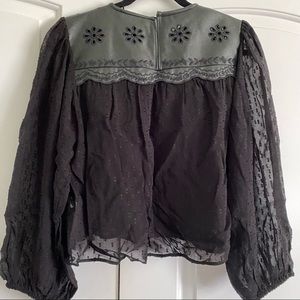 Black sheer loose blouse with puff balloon sleeves. Faux leather collar with float embroidered cutout details. Keyhole back.