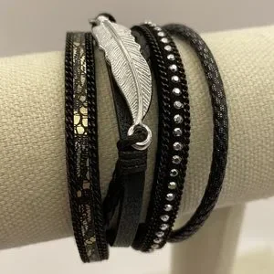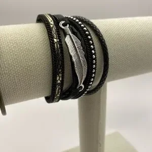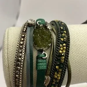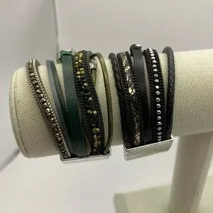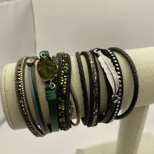 Set of two wrap bracelets with magnetic clasps. One has dark green detail with a genuine crystal charm in the centers the second is black and silver with a feather charm. Some scratches on hardware on back where magnetic clasps are.