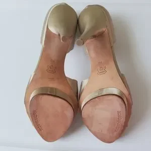 some discoloration on leather soles, and small mark on back of heel as seen in pictures, neither visible when wearing