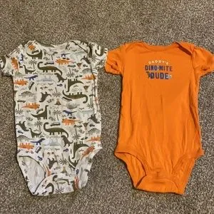 3 short sleeve 18 month Carter’s onesies, all dinosaur themed. All gently loved. Orange one has small imperfections as shown, not noticeable when worn.