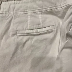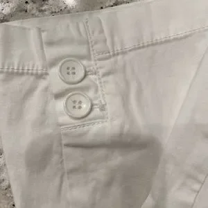 EUC, these white capri pants from Talbots (aka Pedal Pushers) have a zipper front with two hook closures at the waistband, front and back pockets, and a 2-button detail at the bottom of the leg. White trim on the inside of the waistband.