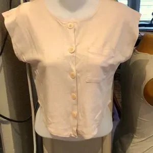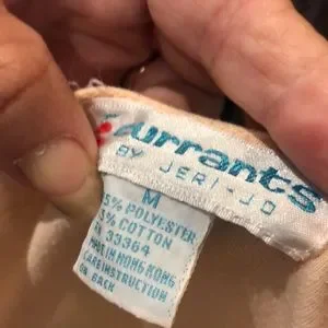 Vintage Currants by Jeri Jo pale coral 65% polyester 35% cotton lightweight front and back longer than sides see pics; faintly visible brown spots on front see pics otherwise in great condition button down the front with left breast pocket say size Med.. right across the breasts best fit small female 32 or lower breasts